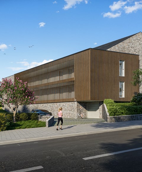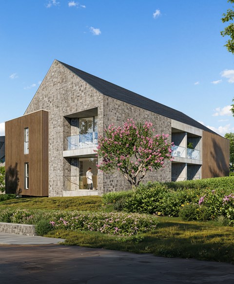 Inspirée de l’architecture régionale, la résidence en reprend les codes avec délicatesse : moellons, bardage en bois naturel, toiture en ardoise. Ces matériaux, sélectionnés pour leur authenticité et leur durabilité, traduisent une volonté d’inscrire le projet dans son époque tout en respectant l’âme du lieu. L’ensemble architectural se distingue par ses lignes épurées, sa volumétrie équilibrée et son implantation réfléchie, qui valorise à la fois la lumière et les vues sur le paysage environnant.